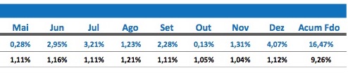 | Rentabilidades 2016. Em azul o fundo, em preto o CDI. |